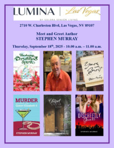 I will be selling and signing copies of all six of my novels – Discovering the Christmas Spirit, the award-winning, The Chapel of Eternal Love- Wedding Stories from Las Vegas, the critically-acclaimed sequel, Return to the Chapel of Eternal Love – Marriage Stories from Las Vegas, my cozy murder mystery, Murder Aboard the Queen Elizabeth II, the Readers Favorite 5-Star rated crime fiction novel , Discreetly Yours, and copies of my light-hearted paranormal , Yours in Spirit.