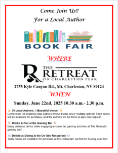 I am very excited to be part of this 30-author book signing event in the lobby of the Retreat on Charleston Peak.